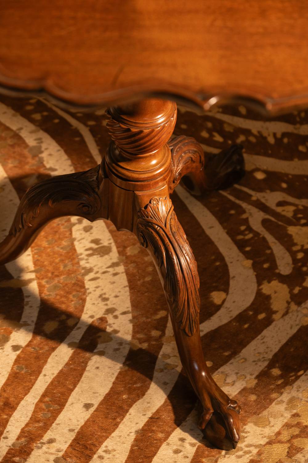 Contact for inquiries. A vintage carved piecrust tilt-top table featuring a scalloped edge, twisted pedestal column, and claw-and-ball tripod base in rich mahogany.