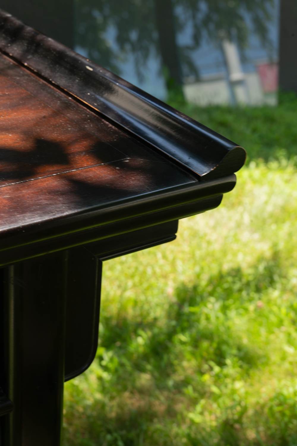 Contact for inquiries. A sleek ebonized console table featuring five drawers with polished brass campaign-style ring pulls, blending Asian-inspired lines with modern craftsmanship.