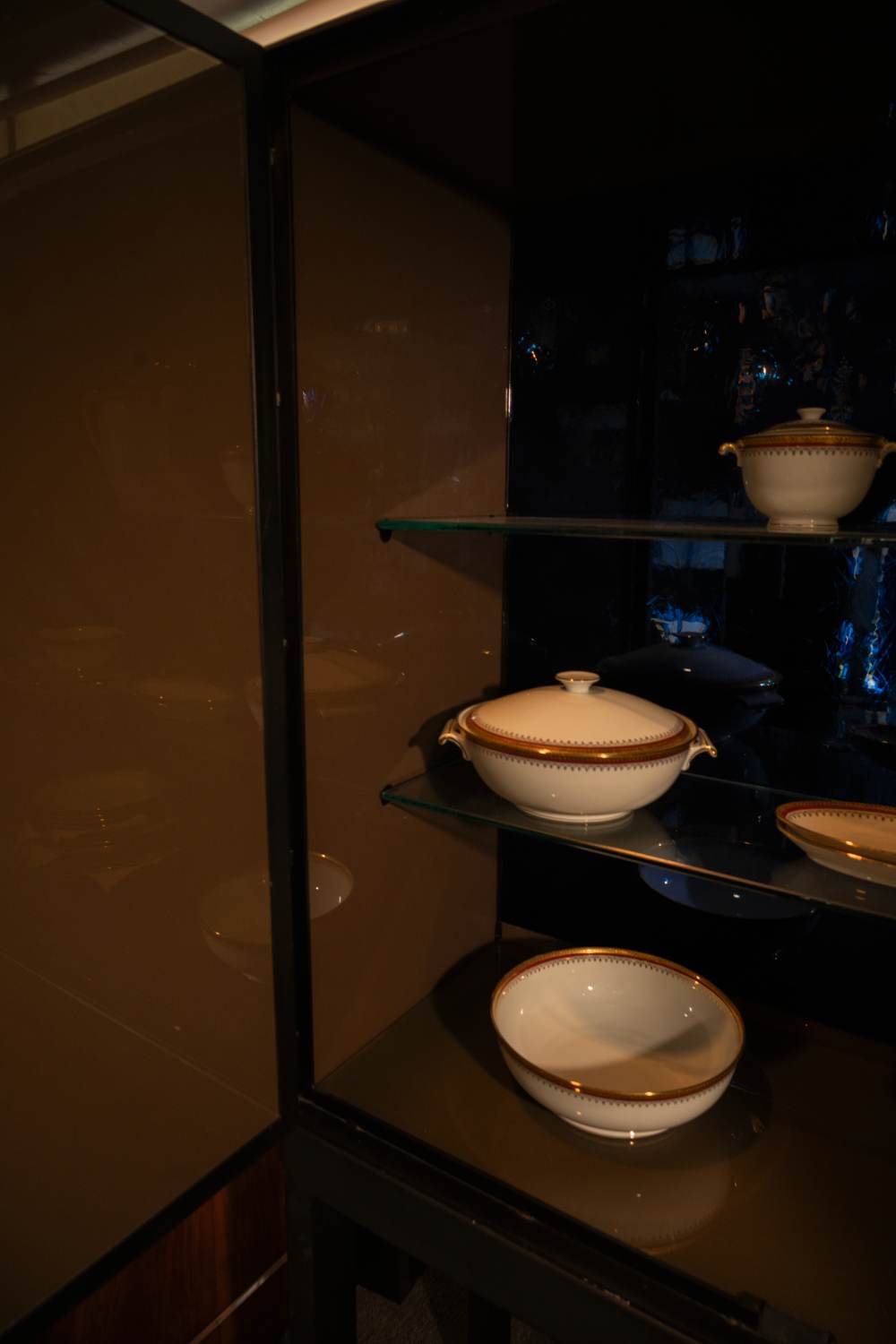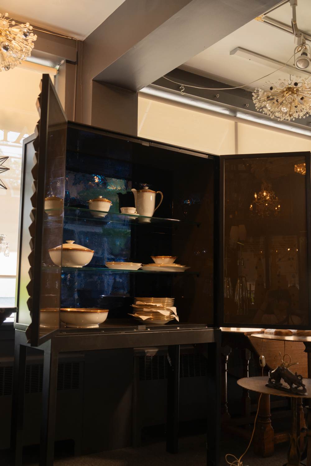 A modern sculptural cabinet featuring 3D geometric relief doors in bronze tones and a striking blue interior lined with glass shelves.