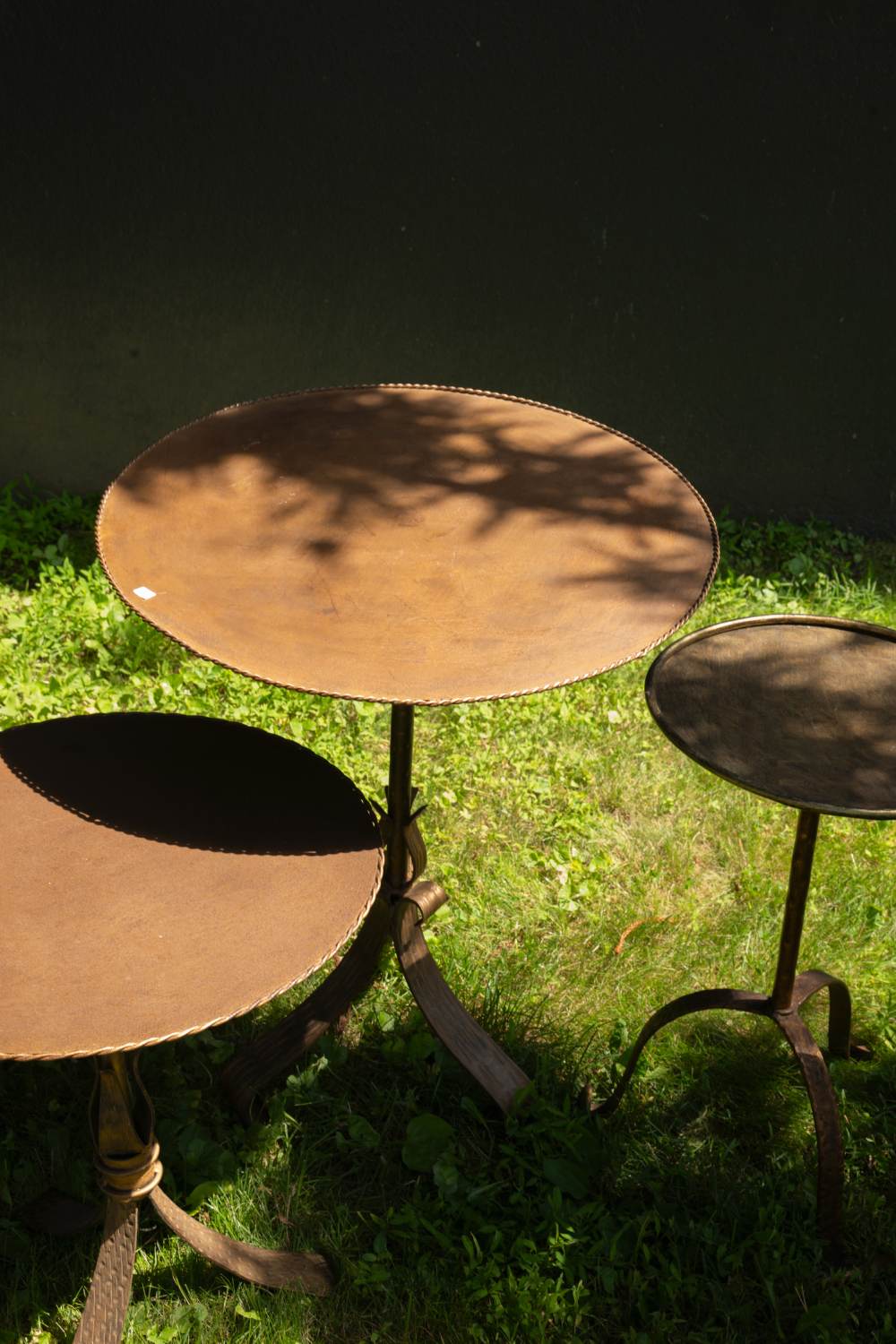 Contact for inquiries. A set of three round nesting metal side tables with textured tops and tripod bases, featuring a warm bronze-brown patina.